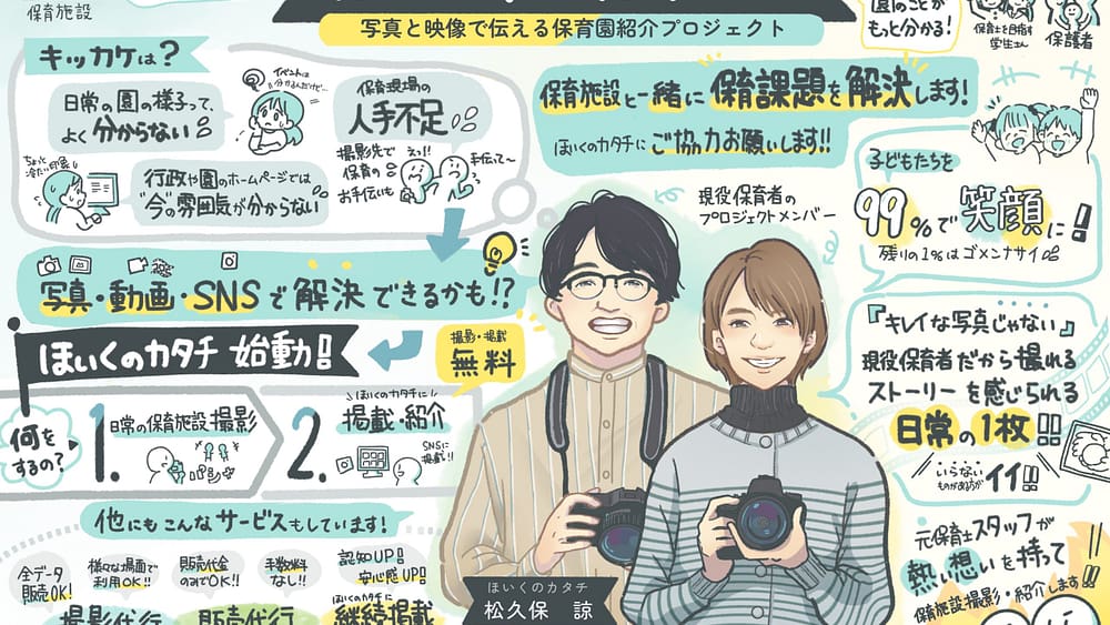 イベント、講演・講座、ワークショップ、研修などをリアルタイムでグラフィックを用いて可視化するグラフィックレコーディング(通称:グラレコ)と、議事録や記事などの文章だけの資料や、動画の内容をじっくり見て全体像を把握してからイラストなどを用いて視覚化し1枚にまとめる(レポートする)グラフィックレポート(通称:グラレポ)を行なっています。