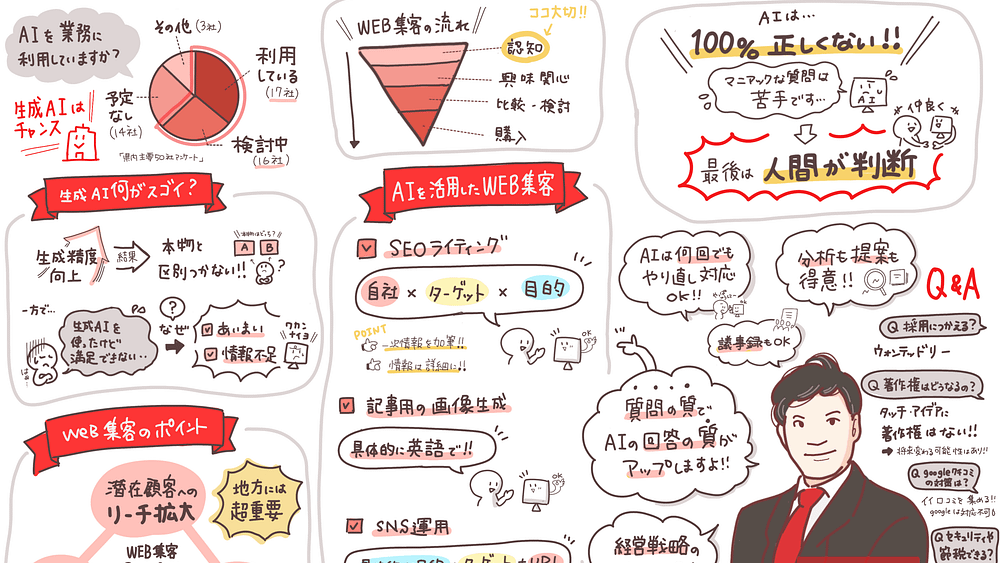 その場での状況に応じて柔軟に対応し、参加者の理解を深めるとともに、イベント後には振り返りのツールとしても活用できます。参加者がその場でグラレコを見返すことで、内容の再確認ができ、満足度が大きく向上します。
