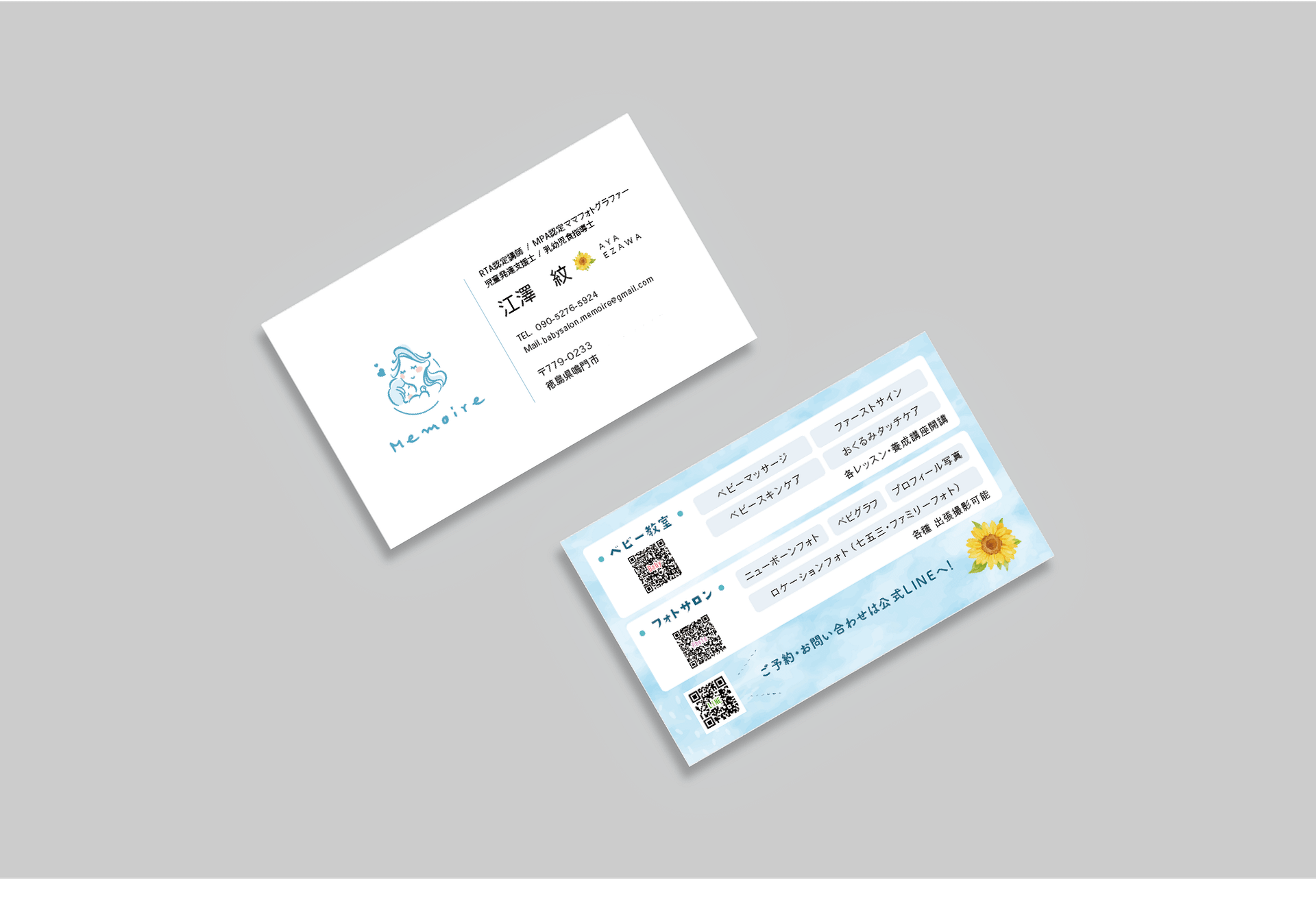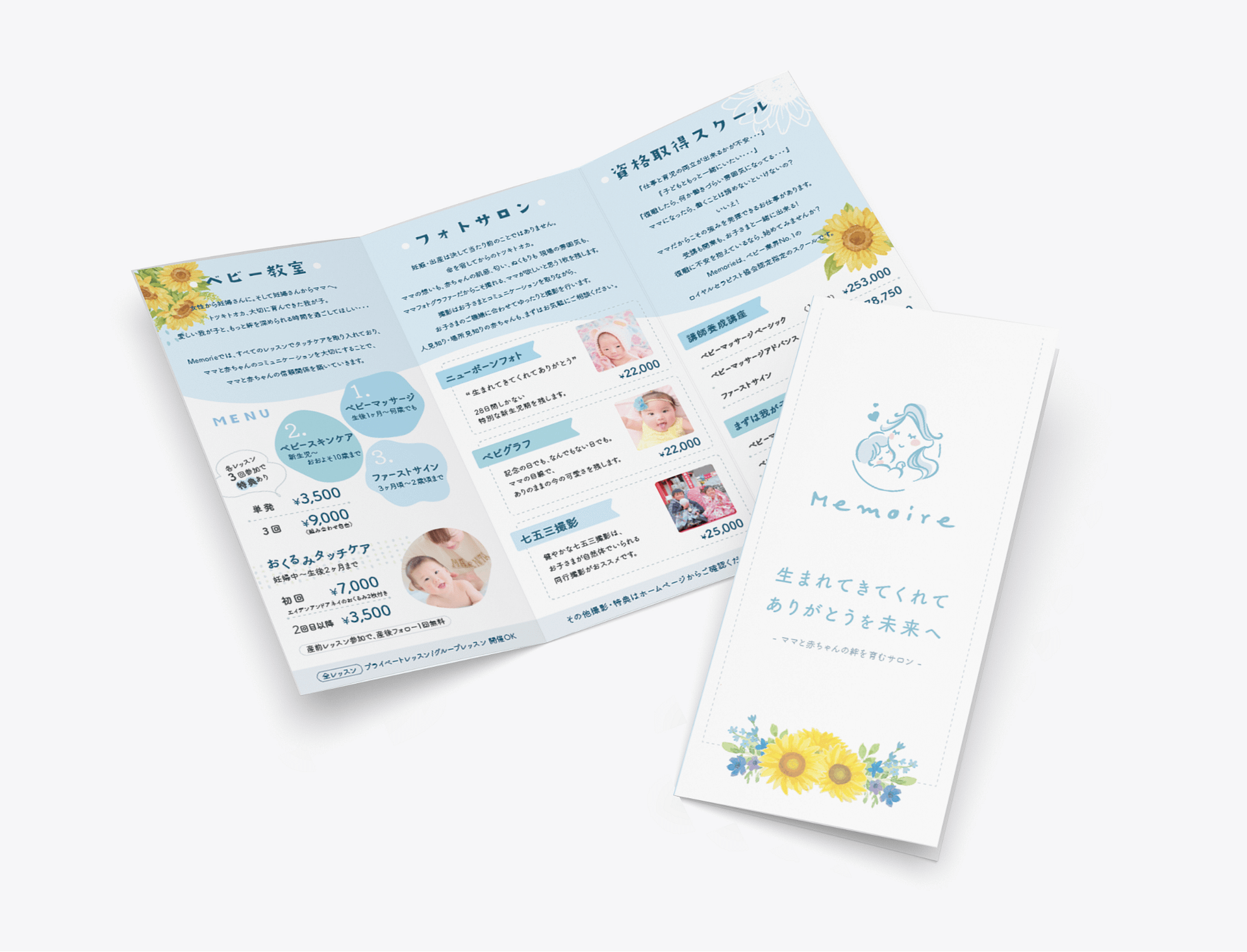 今回は、「生まれてきてくれてありがとうを未来へ」をキャッチコピーに、ママと赤ちゃんを育むサロン「memoire」のサービス紹介の3つ折パンフレットとロゴを制作させて頂きました!