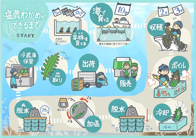 今回はその鳴門の塩蔵わかめができるまでの工程を図解したイラストとして制作いたしました!