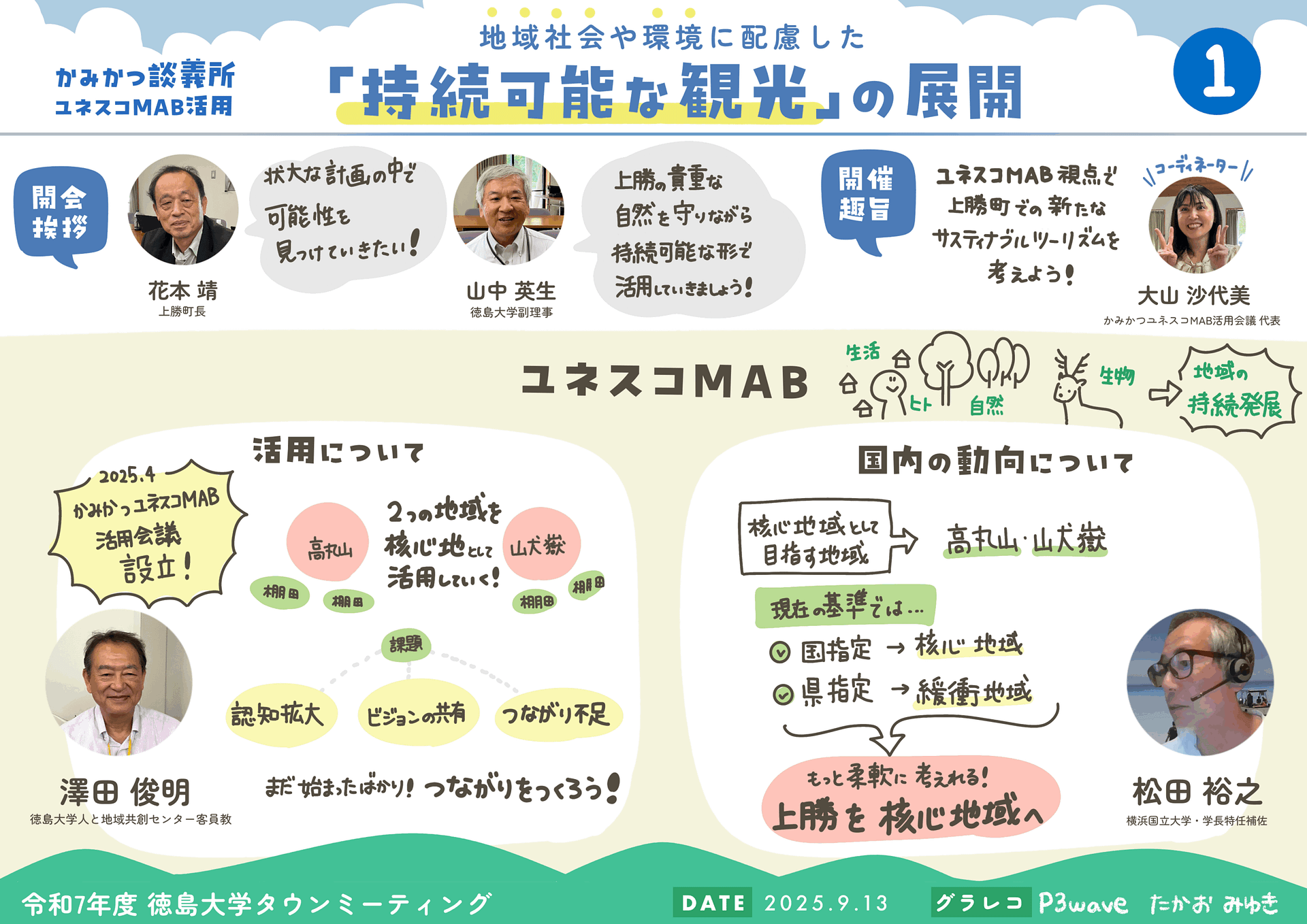 令和7年度 徳島大学タウンミーティングとして開催された「地域社会や環境に配慮した『持続可能な観光』の展開」をテーマとした講義・意見交換の場におけるグラフィックレコーディングを行いました。
